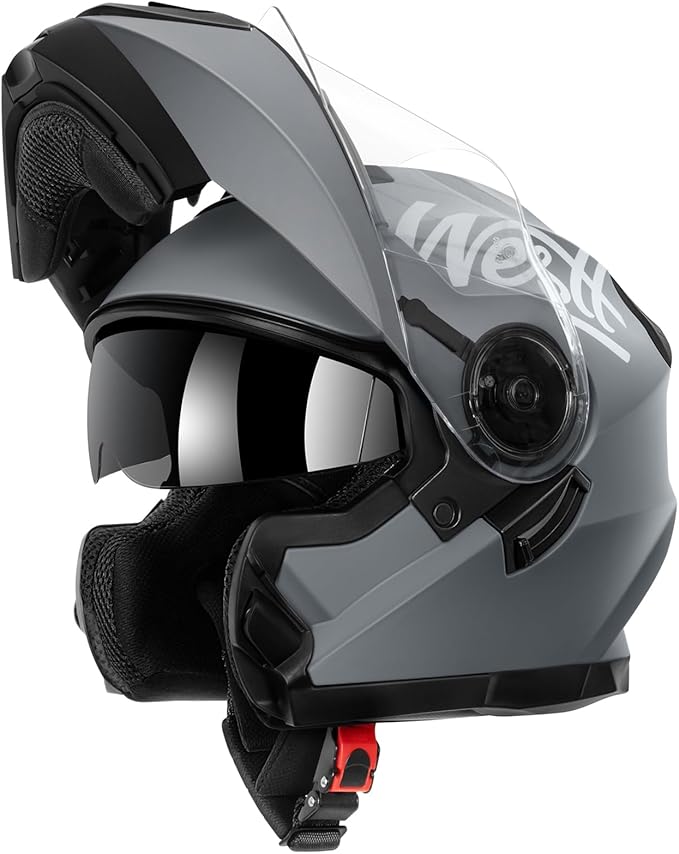 Westt Full Face Motorcycle Helmet is a modern, safe, and stylish helmet that meets DOT certified standards. It is priced at 24,074.69pkr, which provides excellent value in terms of quality and features. It features a sturdy ABS shell, soft inner padding, a dual visor system, and four ventilation holes that maintain airflow. Its liftable design makes it suitable for all weather and travel.
